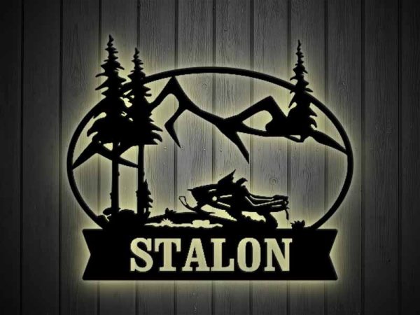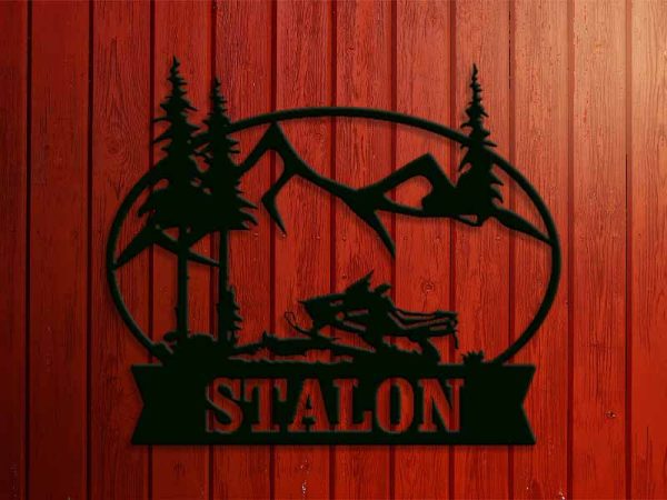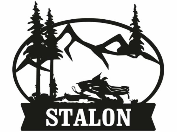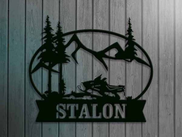 Tyylikäs henkilökohtainen takomuotoinen taulu luontokuvalla, jossa on vuoria, puita ja lumikelkka.