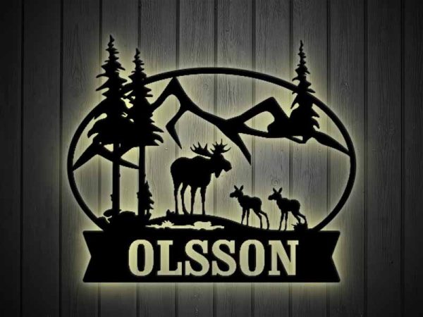 Tyylikäs henkilökohtainen takorautainen taulu luontokuvalla, jossa on vuoria, puita ja hirvi lehmä vasojensa kanssa.