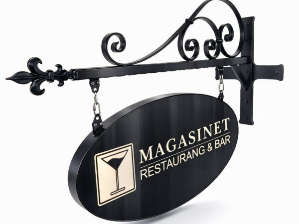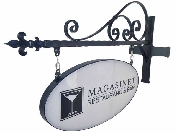 soikea kyltti, jonka koko on 750×380 mm, jossa nimesi aina loistaa, on valokyltti, joka on valmistettu metallista ja voidaan kiinnittää joko kiinteästi tai riippuvasti ketjuilla.