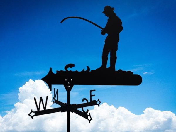 Kalastajaa esittävä tuuliviiri seisomassa vedessä.